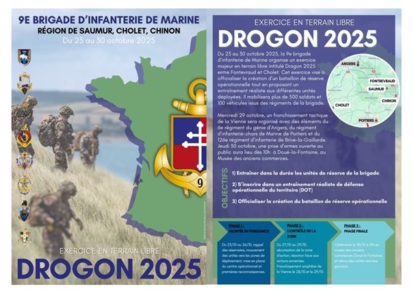Du 23 au 30 octobre 2025, la 9e brigade d’infanterie de Marine organise un exercice majeur en terrain libre intitulé Drogon 2025 entre Fontevraud et Cholet.