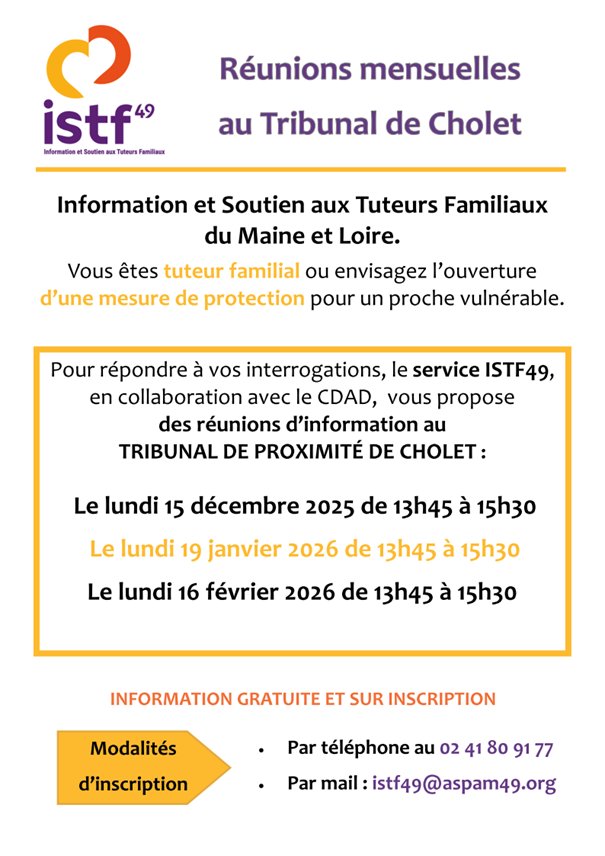 Le service d’Information et de Soutien aux Tuteurs Familiaux du Maine et Loire organise chaque mois une réunion d’information au Tribunal de Proximité de CHOLET, en collaboration avec le CDAD.
