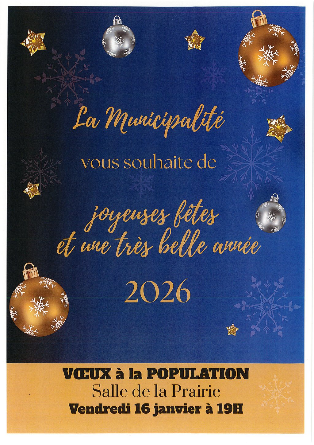 La municipalité vous souhaite une très belle année 2026 et a le plaisir de vous convier aux VOEUX à la population, salle de la Prairie, le VENDREDI 16 JANVIER à 19H00.