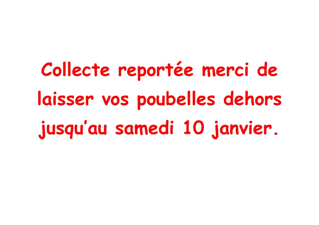 - les collectes de déchets prévues du mardi 6 janvier au mercredi 7 janvier reportées jusqu'au samedi 10 janvier.