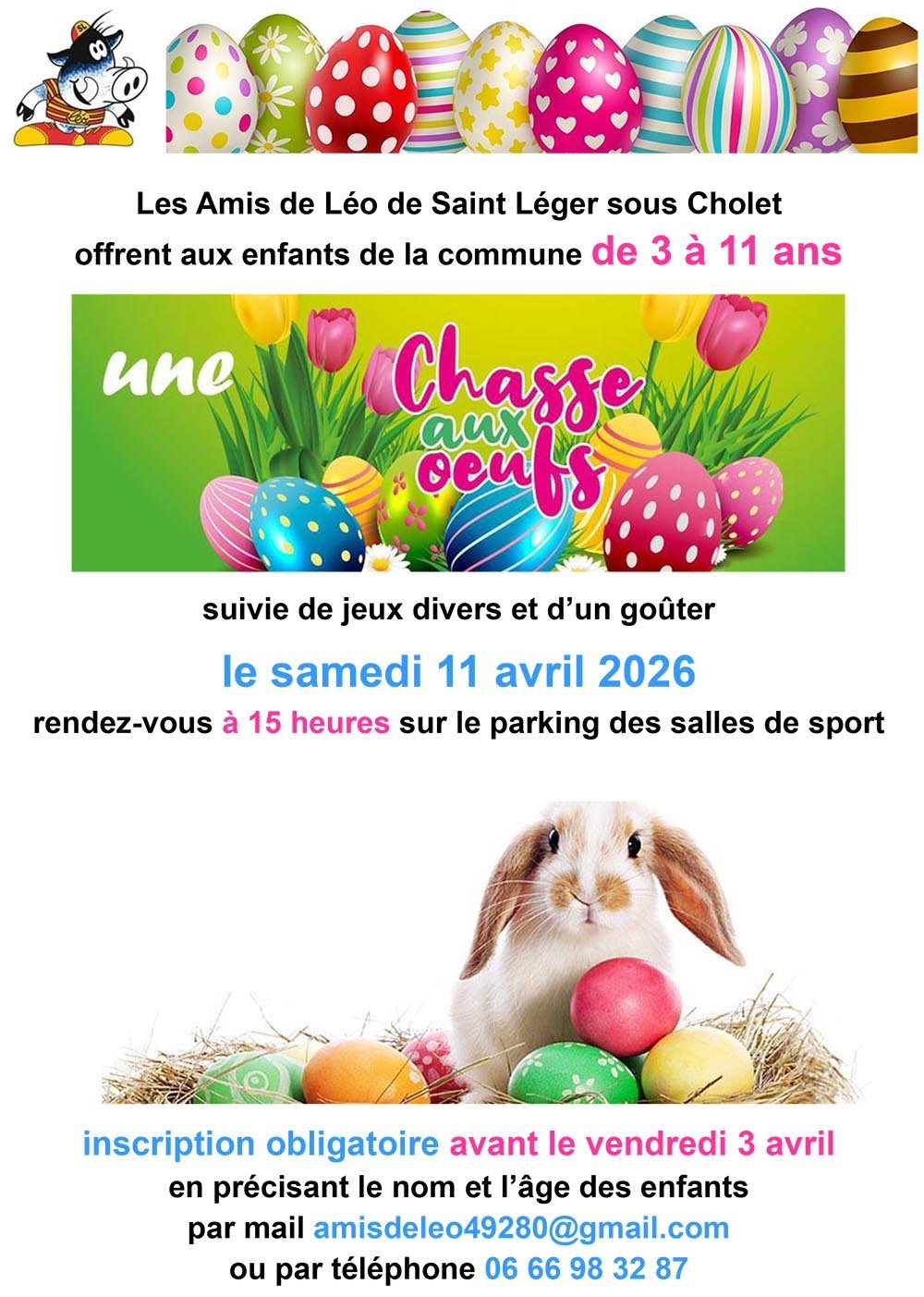 Les Amis de Léo de Saint-Léger-sous-Cholet offrent aux enfants de la commune de 3 à 11 ans une chasse aux oeufs.